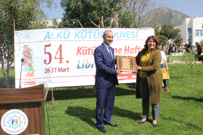 Programın açılış konuşmasını yapan Rektörümüz Prof. Dr. Ahmet Pınarbaşı, “Üniversite camiası olarak biz de okuyucuların hayatına renk ve anlam kazandıran kitapların, kitapların korunduğu ve okuyucuların hizmetine sunulduğu kütüphanelerin önemini çok iyi biliyoruz. Bu nedenle bu haftayı kutluyoruz. Bu hafta boyunca kitapların insan hayatındaki öneminin vurgulanması ve bireylere okuma alışkanlığının kazandırılması öncelikli hedefimiz olmalıdır” diye konuştu. Türklerin derin bir kültürel medeniyete sahip olduğuna değinen Rektör Pınarbaşı, “Biz Türkler kadim bir geçmişe, kültüre ve derin bir medeniyete sahip bir milletiz. Biz eğer bugün ülke olarak ayakta duruyorsak geçmişimize ait önemli kültür birikimine sahip bir millet oluşumuzdandır. Kültür birikimleri olmayanlar, kendi kültürlerini korumayanlar hep başka emperyal ve yabancı kültürlerin etkisi altında kalarak onların saldırısına, onların işgaline ve onların egemenliğine mahkum olmuşlardır” şeklinde konuştu. Programın hazırlığında emeği geçen Sağlık, Kültür ve Spor Daire Başkanlığına ve ayrıca etkinliğin sponsoru Ergün Kırtasiye’ye teşekkür plaketi verildi.