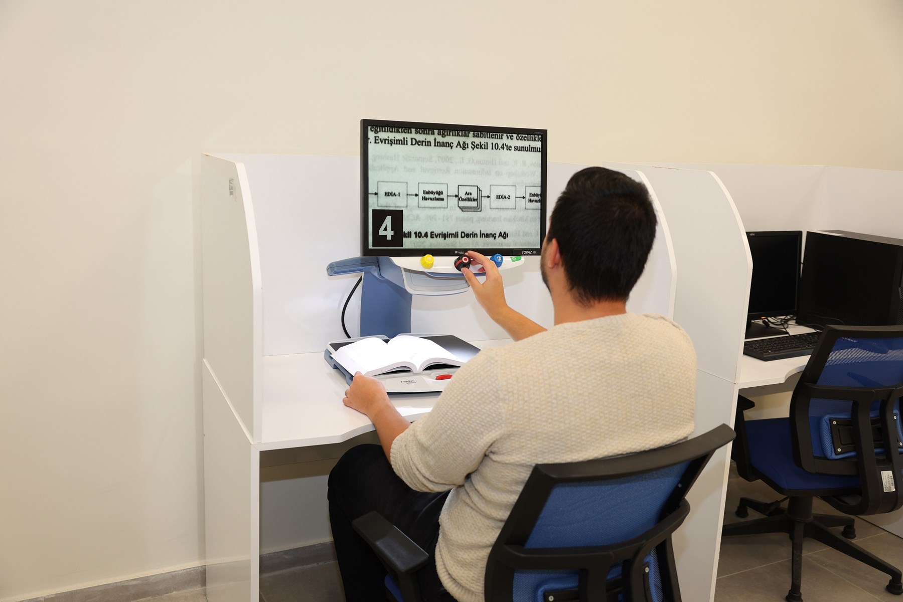 Topaz görme engelli öğrencilerin çalışmalarını kolaylaştırmak amacıyla kullanılan masaüstü video büyütücü cihazıdır. Topaz‘ın kamerası masadan 8.25 inç (yaklaşık 21 cm) uzaktadır. Bu da çalışmak için öğrencilere yeterince ferah bir alan sağlamaktadır. Cihaz sayesinde günlük hayatta incelik isteyen pek çok gereksinim yerine getirilebilmektedir.